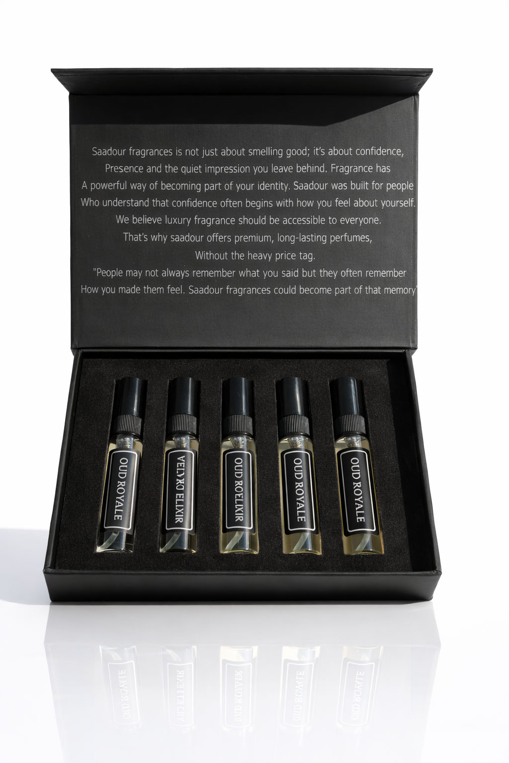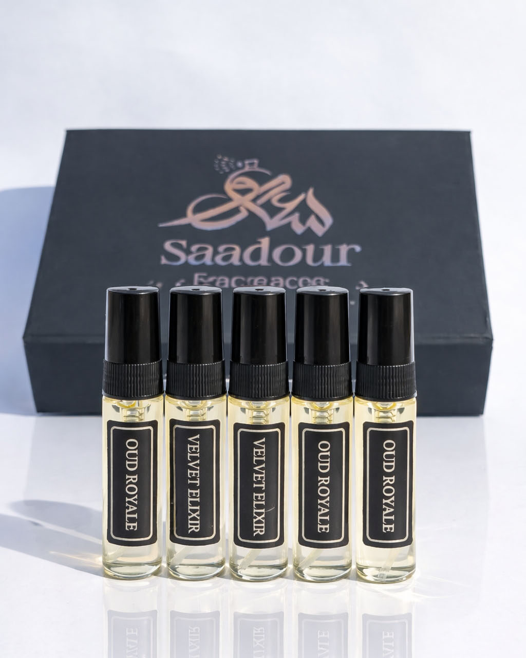 “Explore a world of fragrances with our curated 5×5 ml perfume tester set. Pick your favorites, try them on, and find the scents that truly speak to your style — a luxurious journey in every drop.”